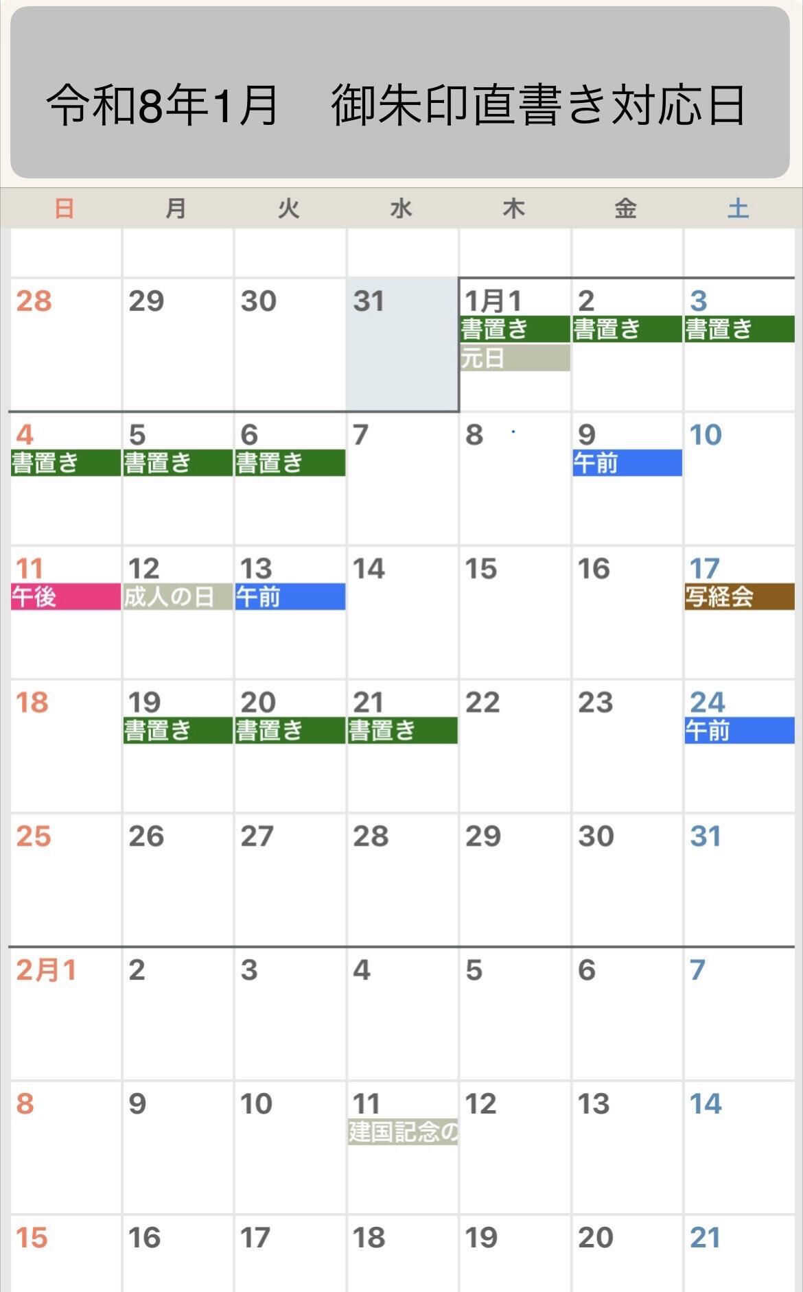 令和8年 1月の御朱印対応日について
